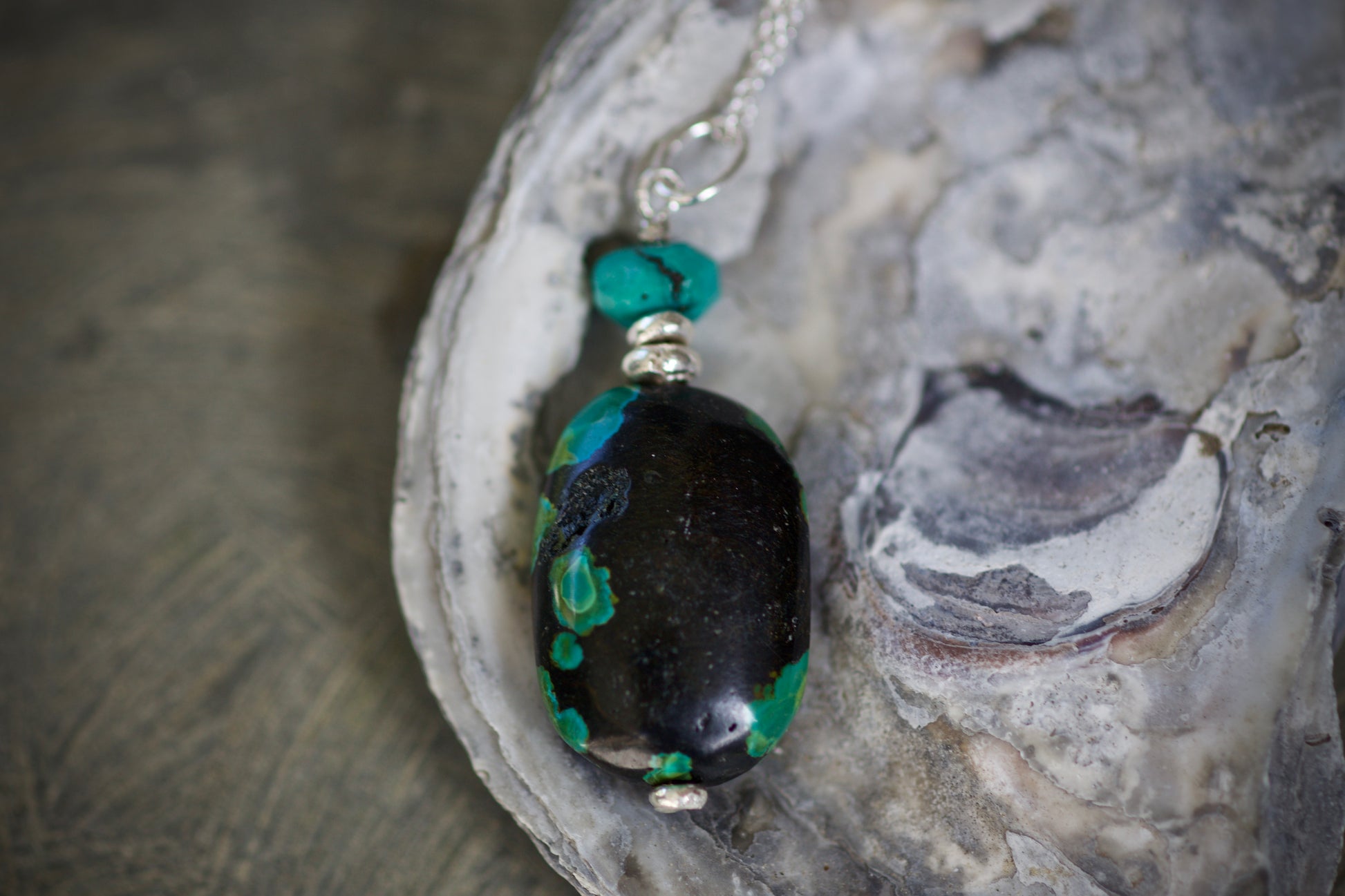 Handmade pendant of turquoise, Thai and sterling silver, measuring 1.75 inches in length on a lightweight 18 inch sterling silver chain.