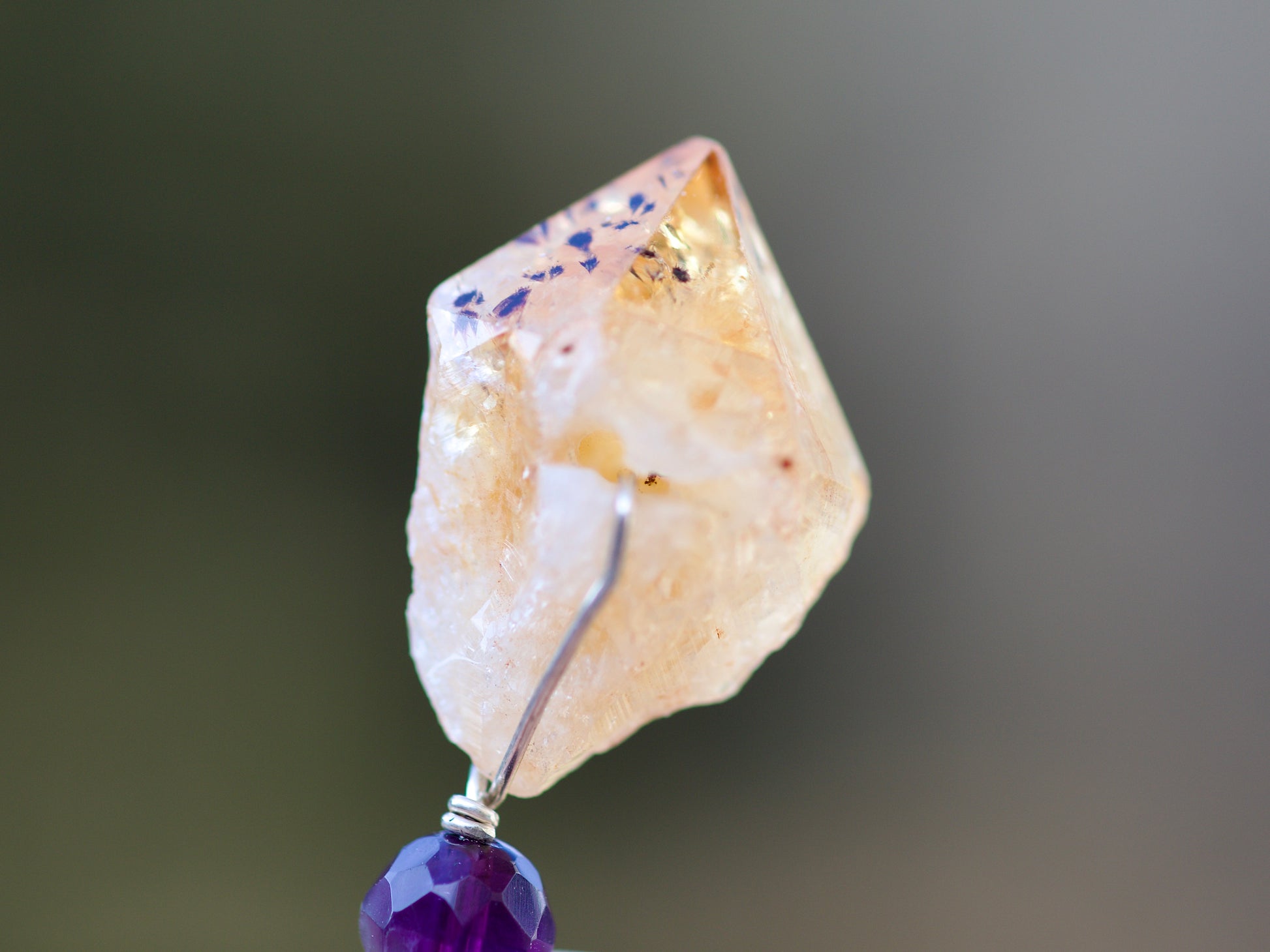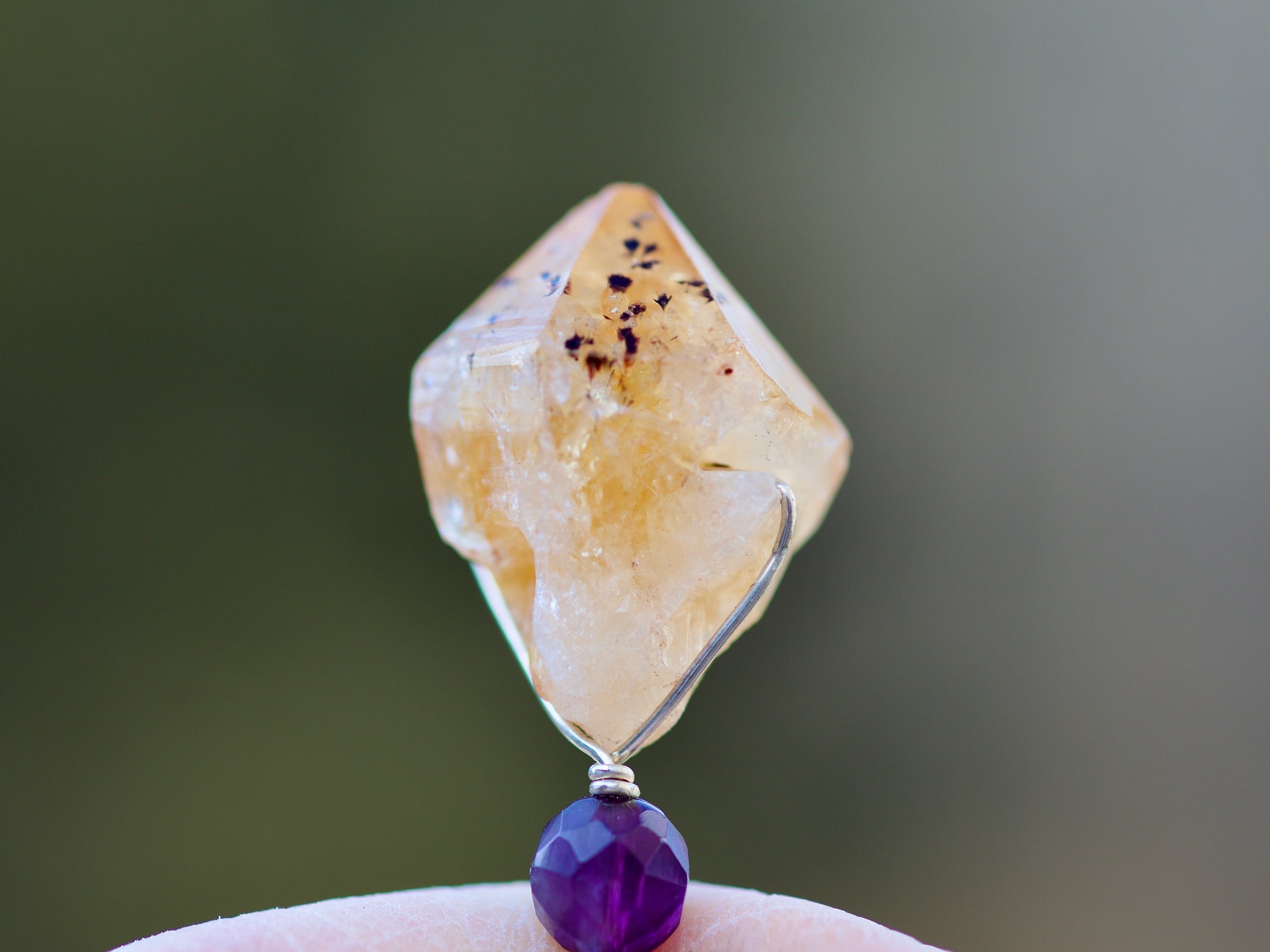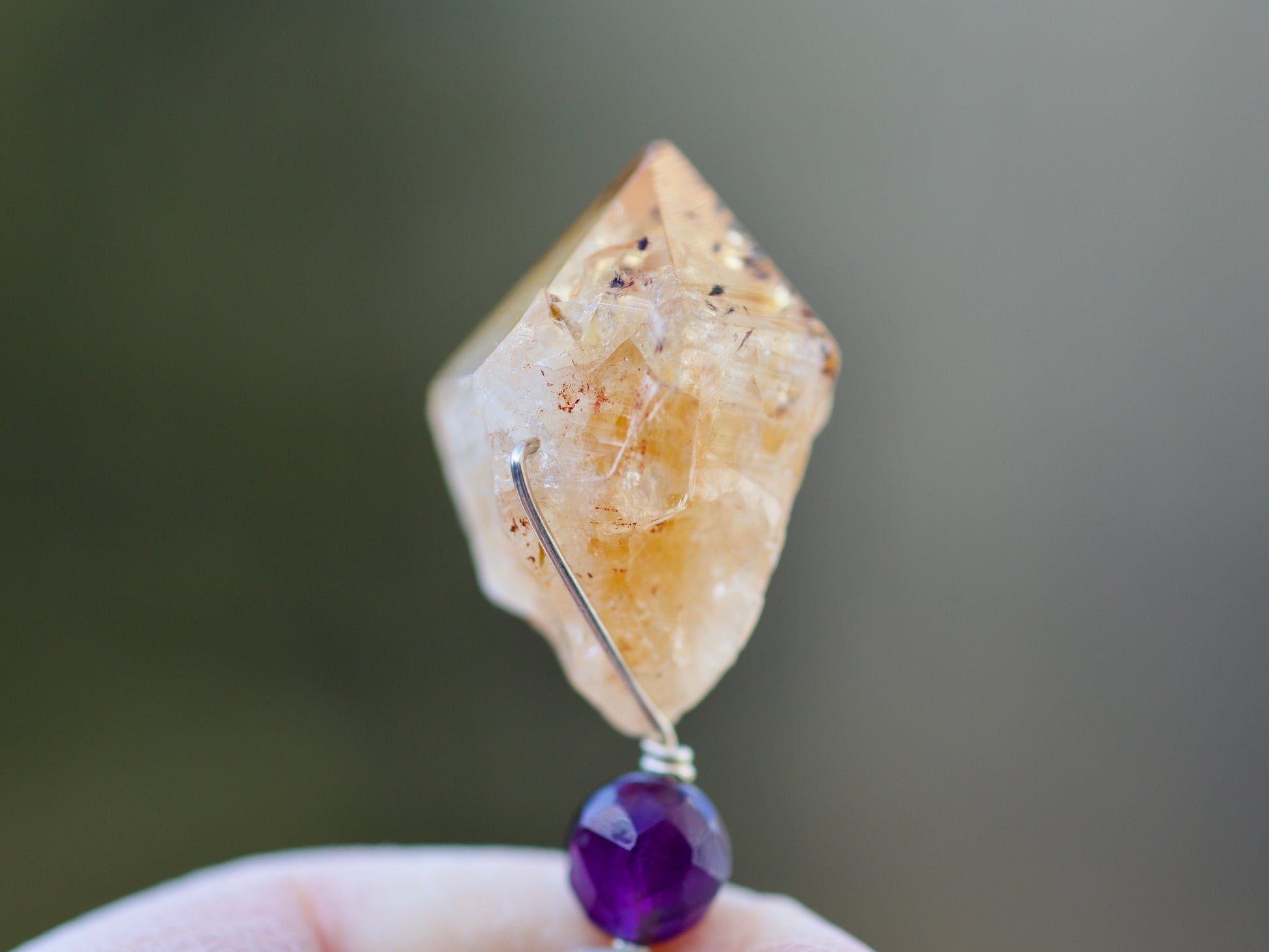 Handmade pendulum of amber, amethyst, citrine point, and sterling silver, measuring about 6.75" in length.