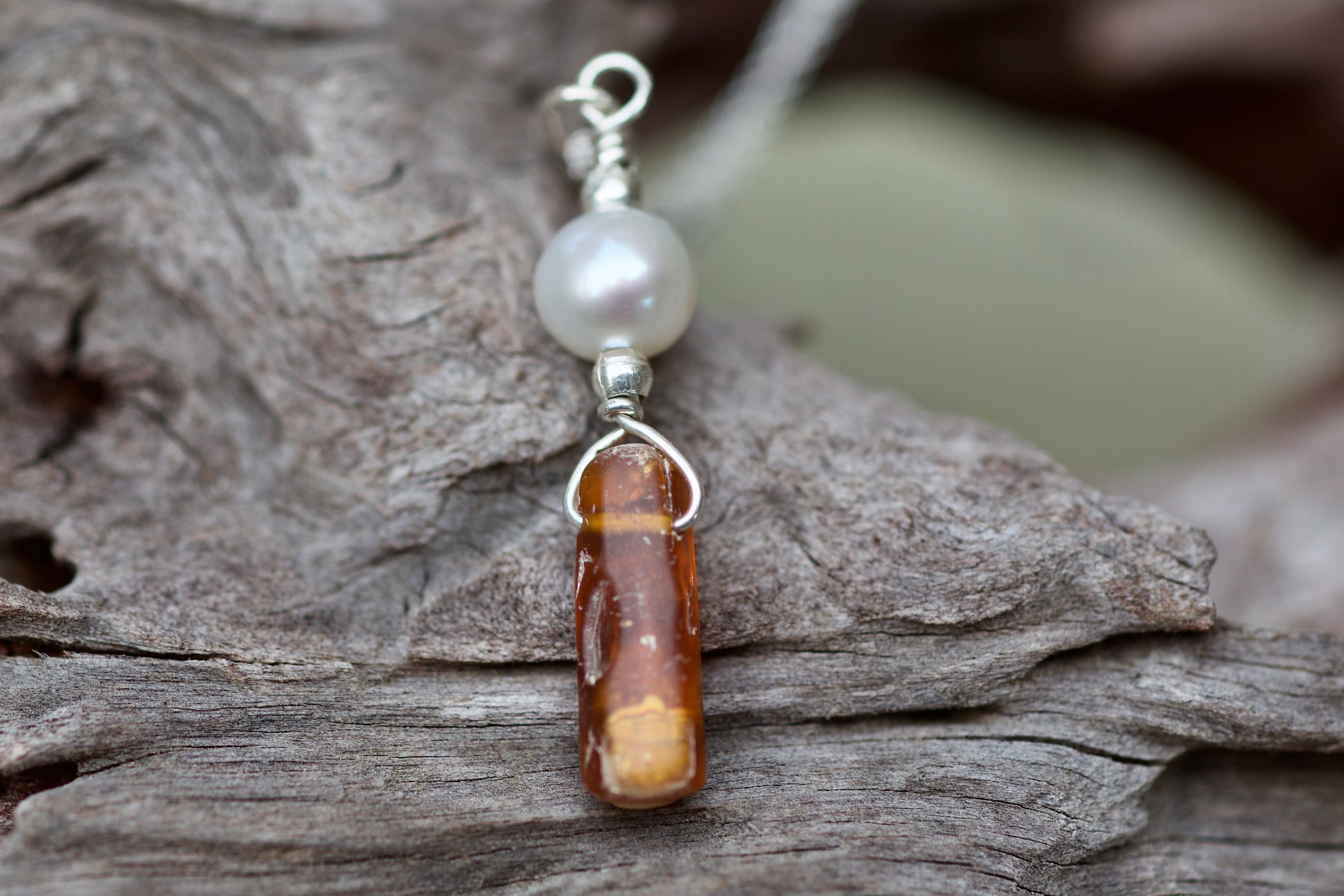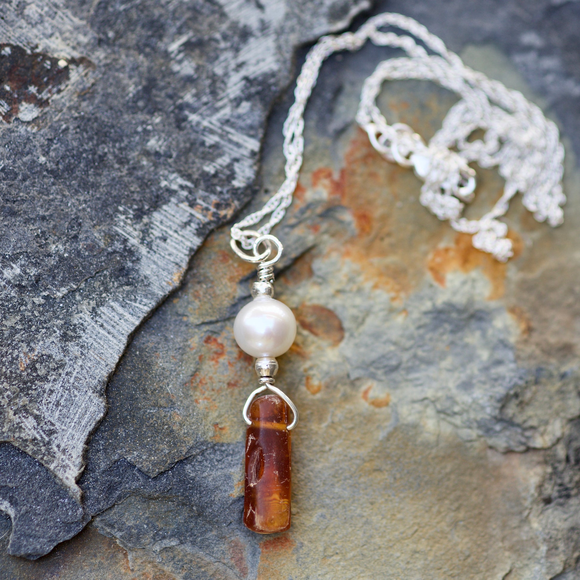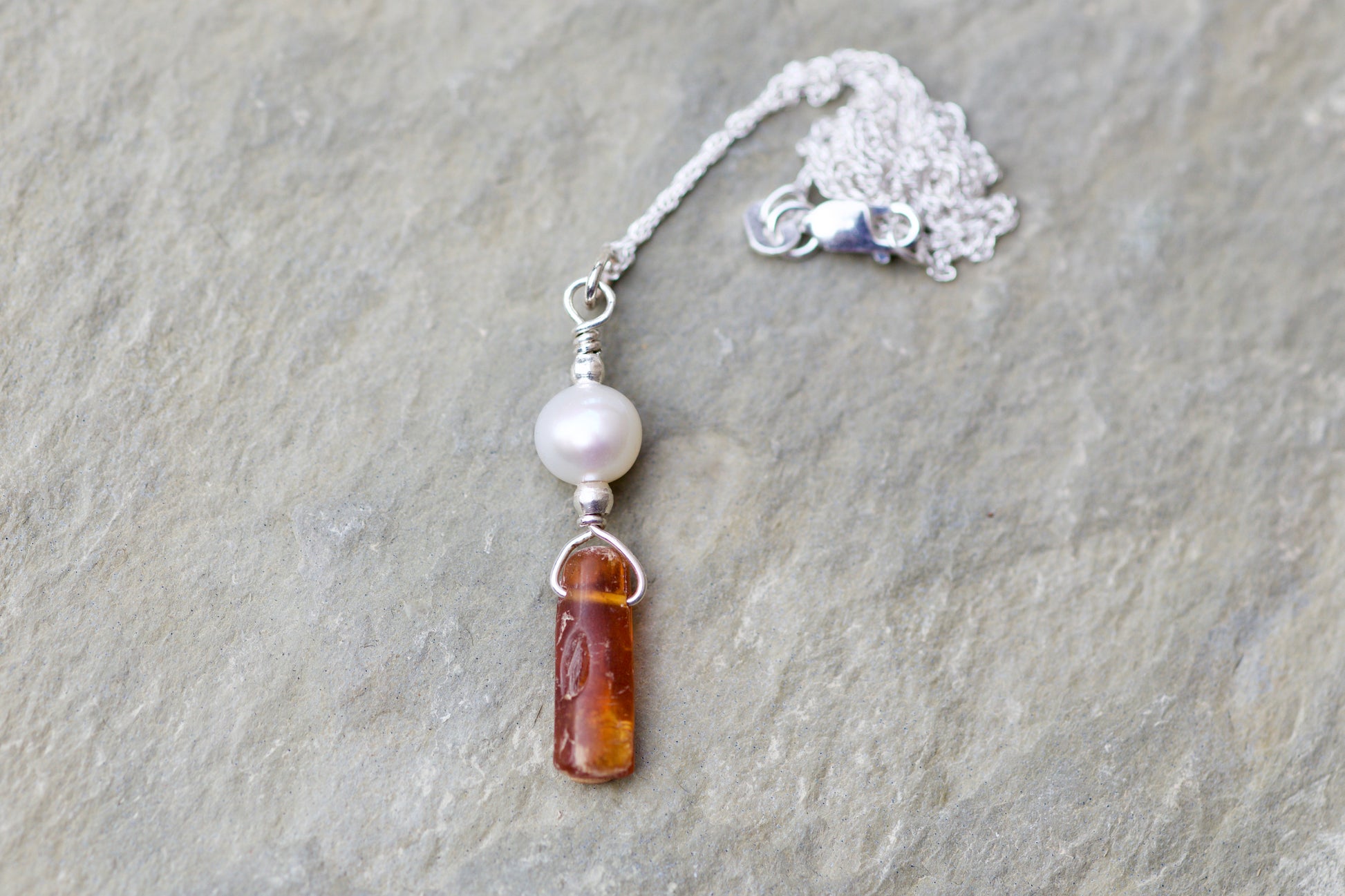 Handmade pendant of freshwater pearl, orange kyanite, and sterling silver, measuring 1.5 inches in length, on a lightweight 18 inch sterling silver chain.