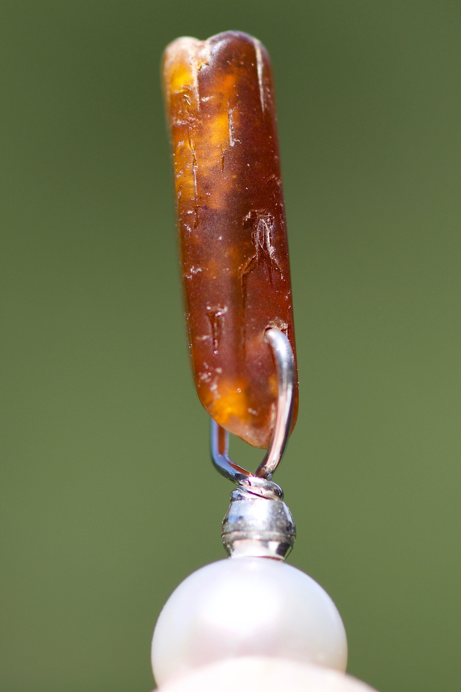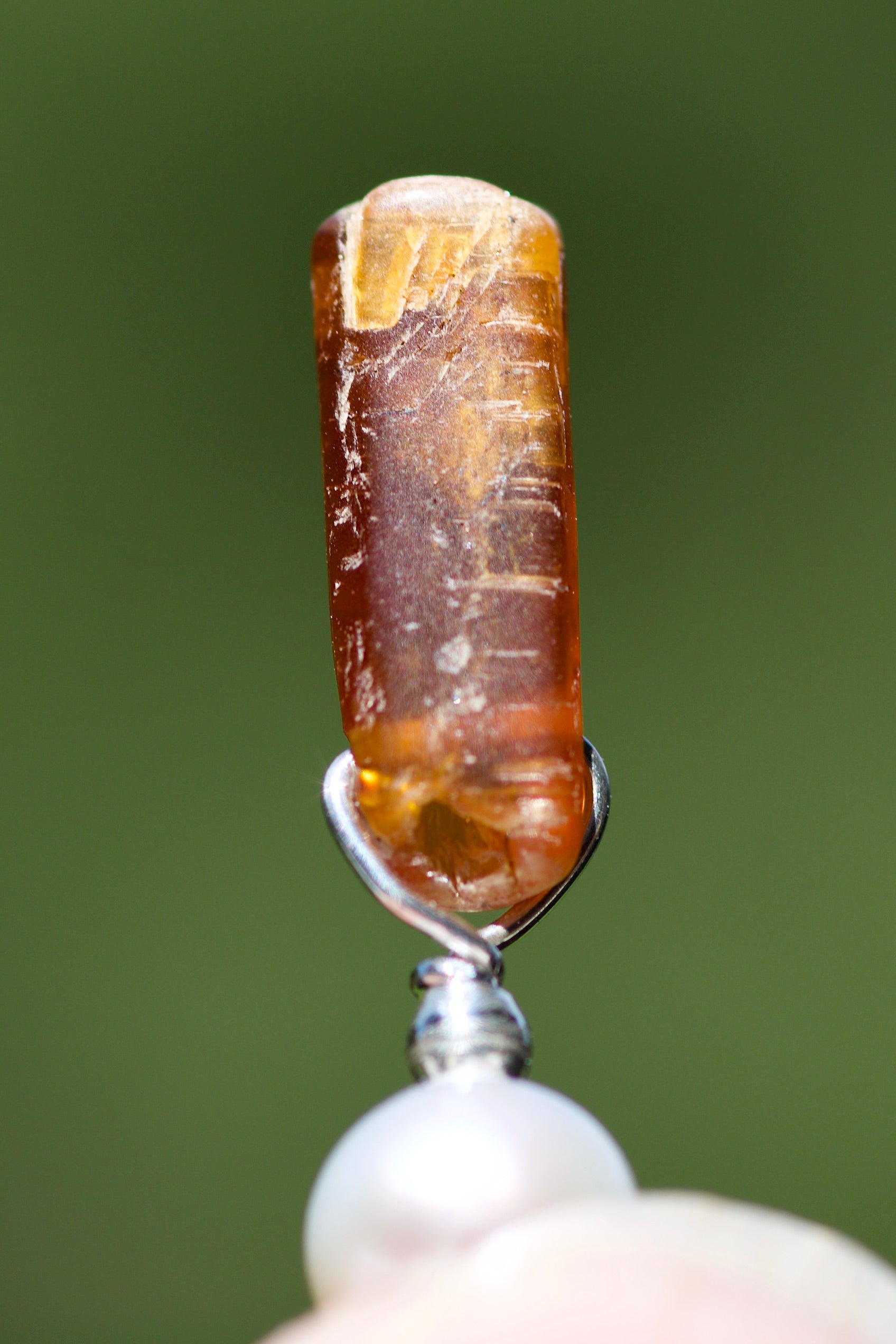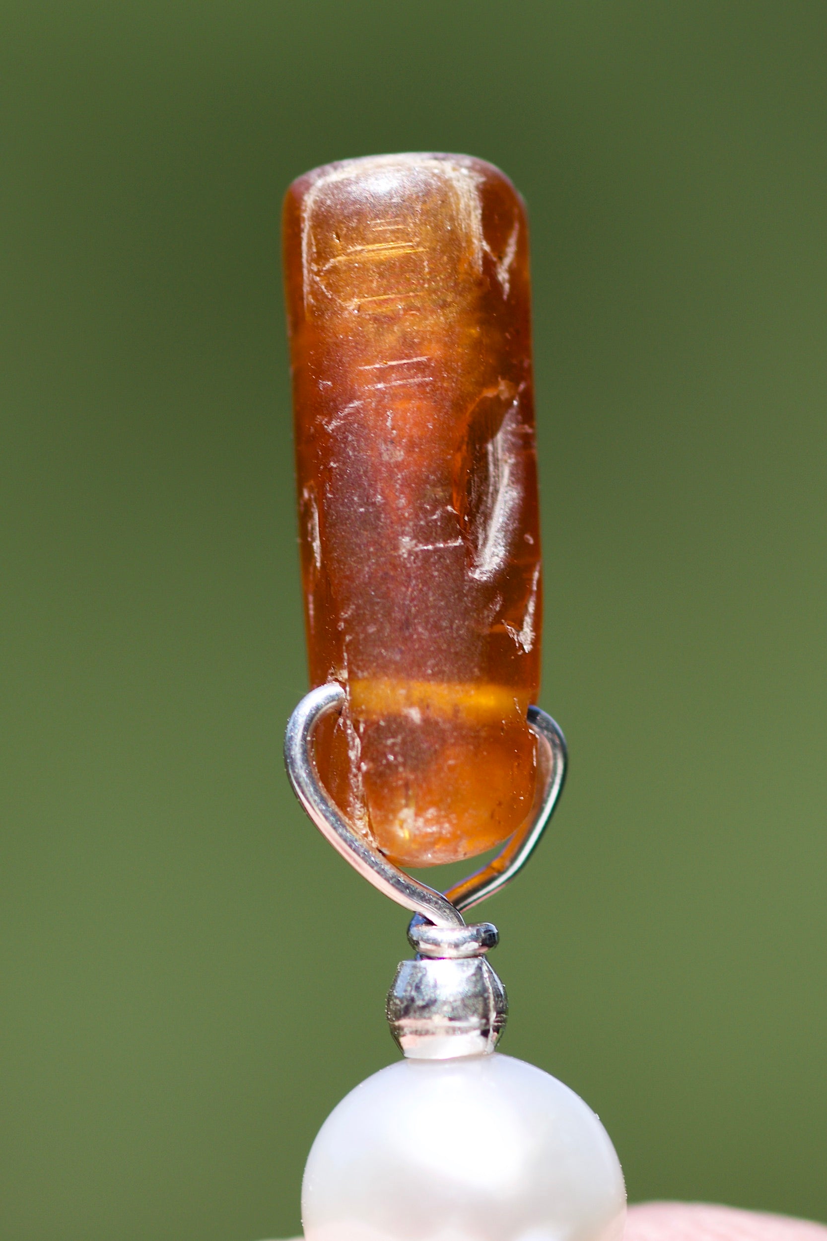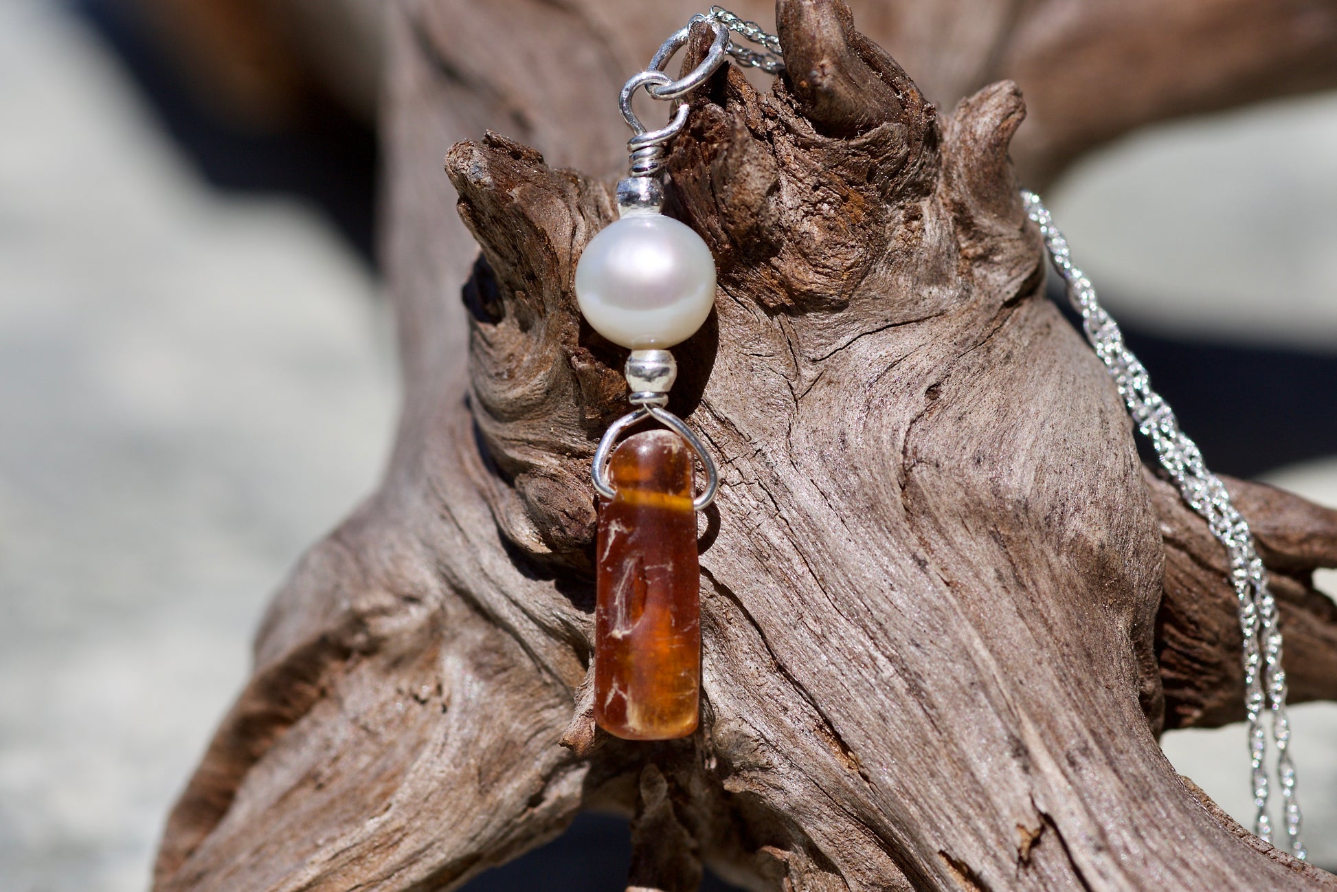 Handmade pendant of freshwater pearl, orange kyanite, and sterling silver, measuring 1.5 inches in length, on a lightweight 18 inch sterling silver chain.