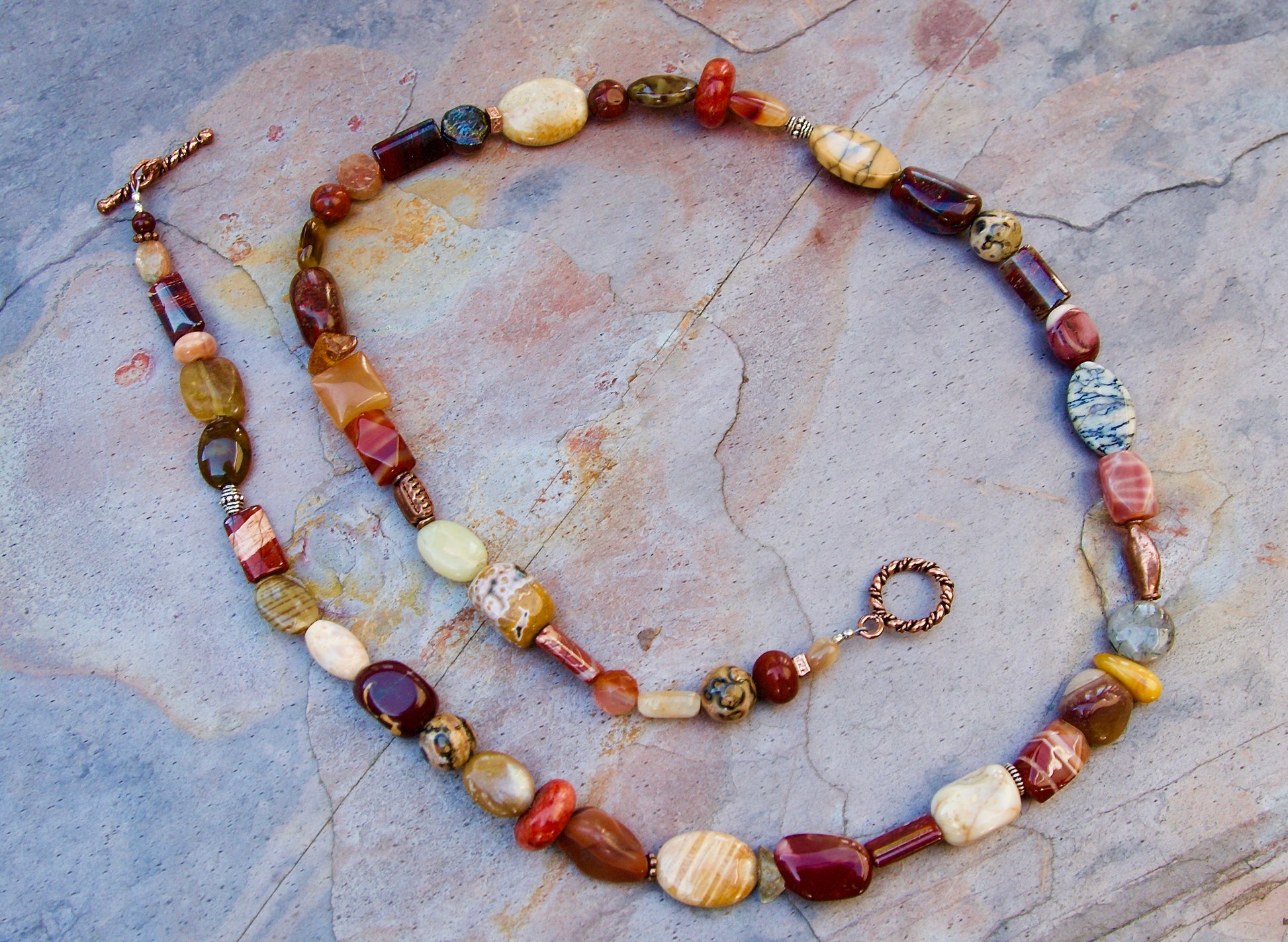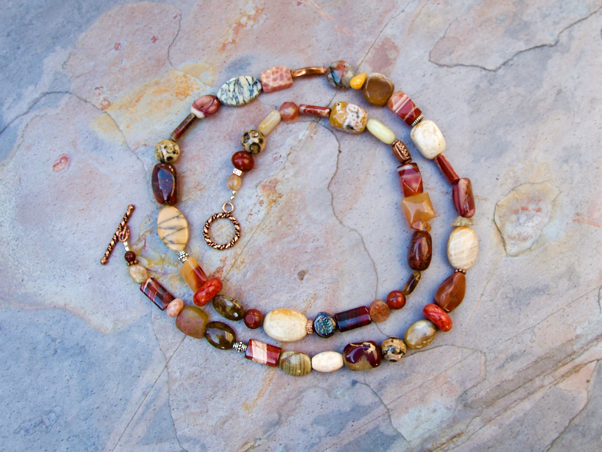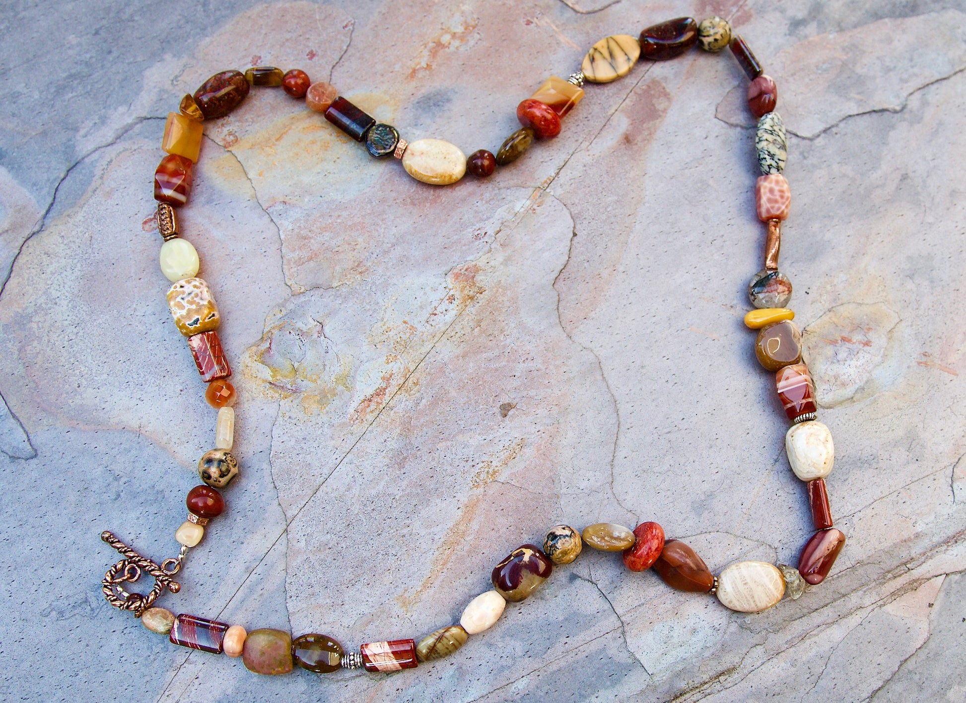 Handmade necklace of many stones with sterling silver and copper, measuring 27 inches in length.