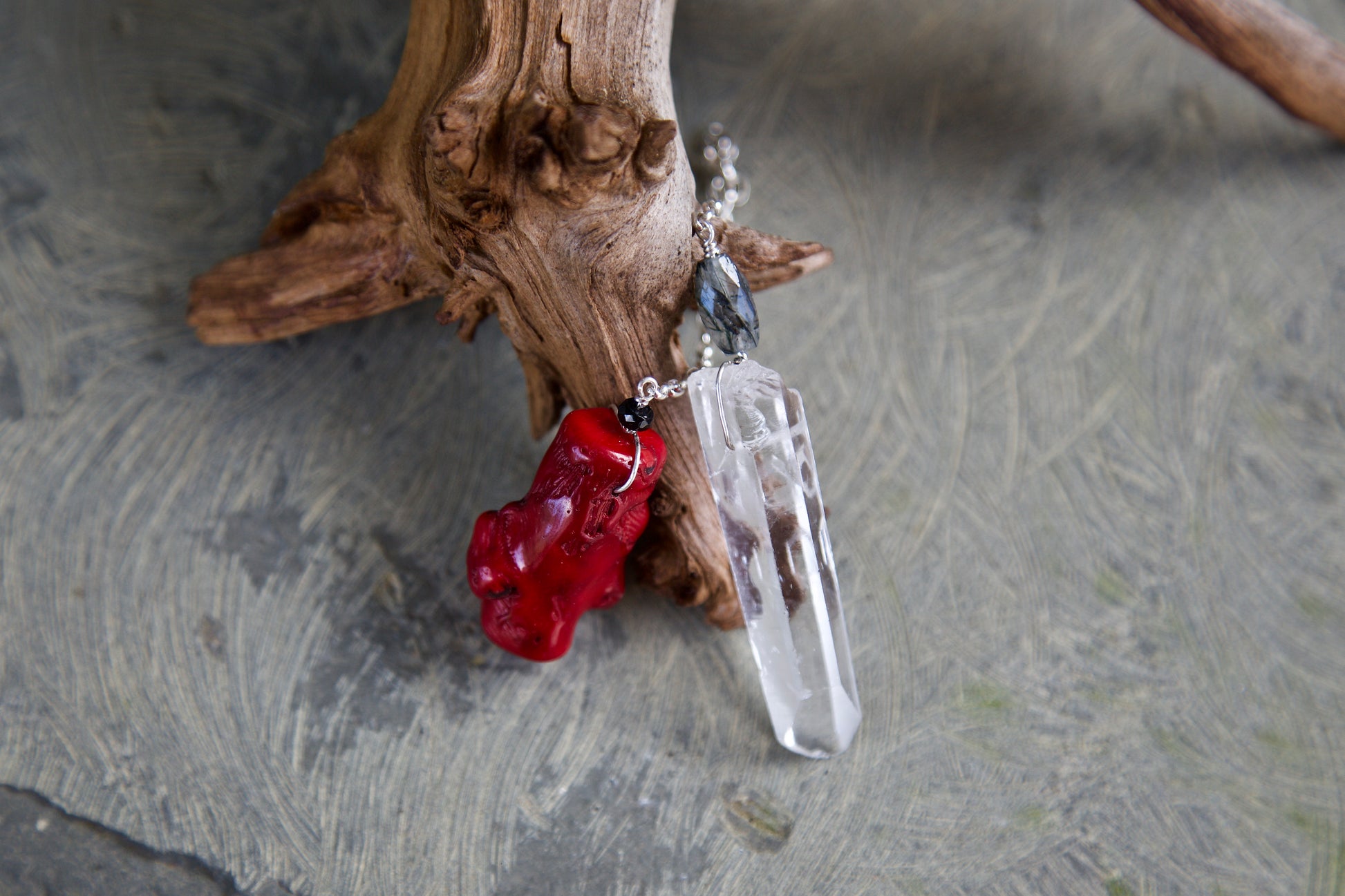 Red Coral, Onyx, Tourmalinated Quartz, Single Termination Clear Quartz Shovel Crystal, and Sterling Silver Double-sided Pendulum
